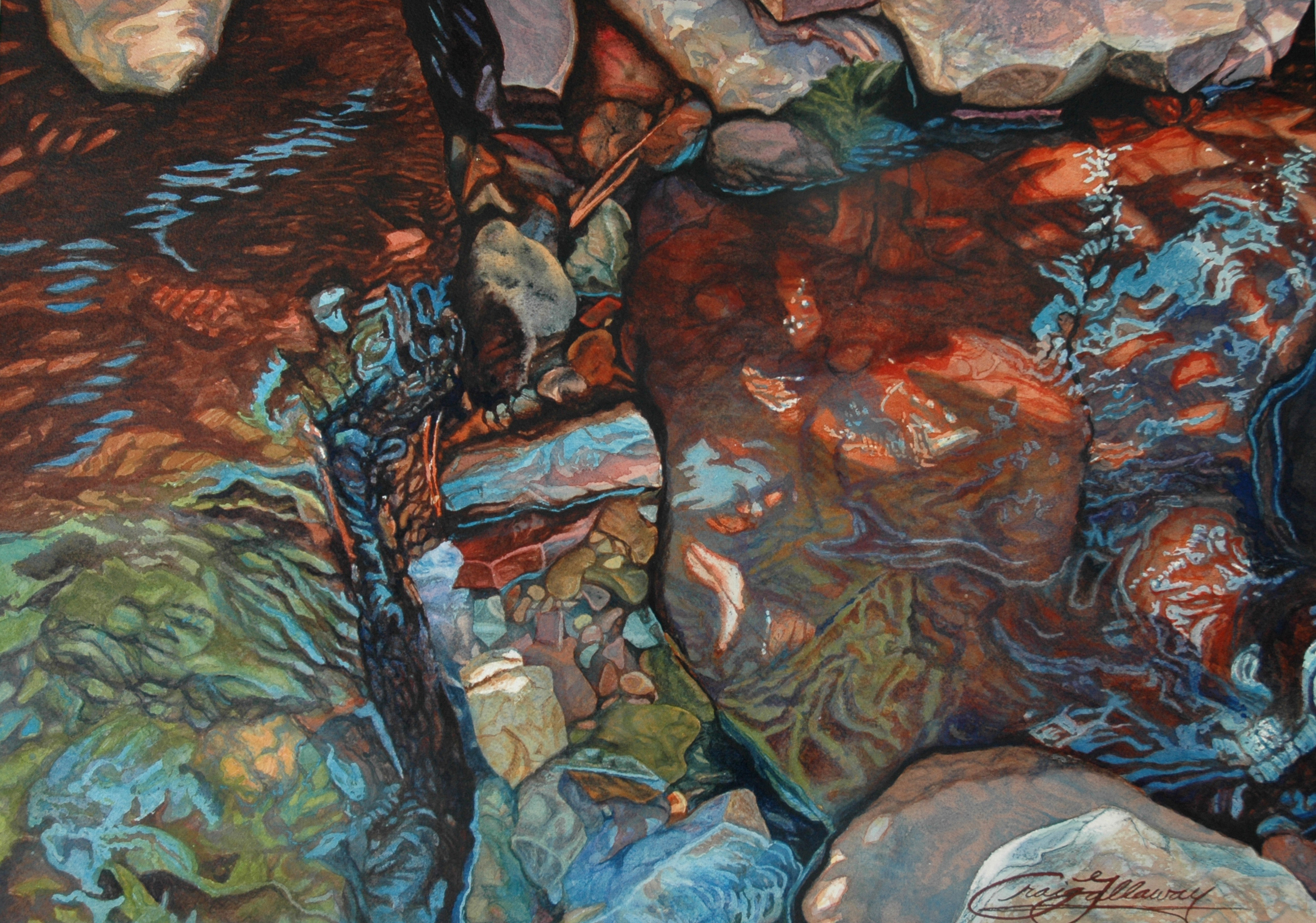 Blue Current, watercolor by Craig Gallaway, copyright 2008. Clear water flowing over exposed rock, reflecting the blue light of the sky, reminds me of the waters of baptism. And those waters represent, for those who put their lives in his hands, the cleansing and transforming power of Jesus’s life, death, and resurrection at work in their lives by the presence of his Spirit. A fitting image for the renewal of our covenant with our Maker and Redeemer.